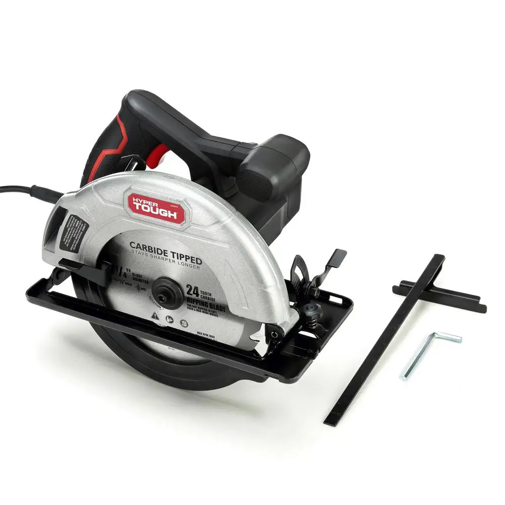 Get those big projects done by using the Hyper Tough New Condition 12 AMP Corded 7-1/4 inch Circular Saw with Steel Plate Shoe, Adjustable Bevel, Blade & Rip Fence.  The sturdy unit comes equipped with a contoured design, as well as a front pommel handle for added comfort and grip.  This circular saw features a powerful 12 amp motor to help increase your productivity with confidence and ease.  It includes one rip fence, blade and a blade wrench.  The Hyper Tough Circular Saw also offers an easy adjustable base for both bevel cutting and cutting depth, as well as a generous 6' cord length for your convenience.  The blade guard is made of metal for added safety and protection.  This basic shop tool will assist you in tackling the many repairs and other home improvement jobs that need be done around the house.