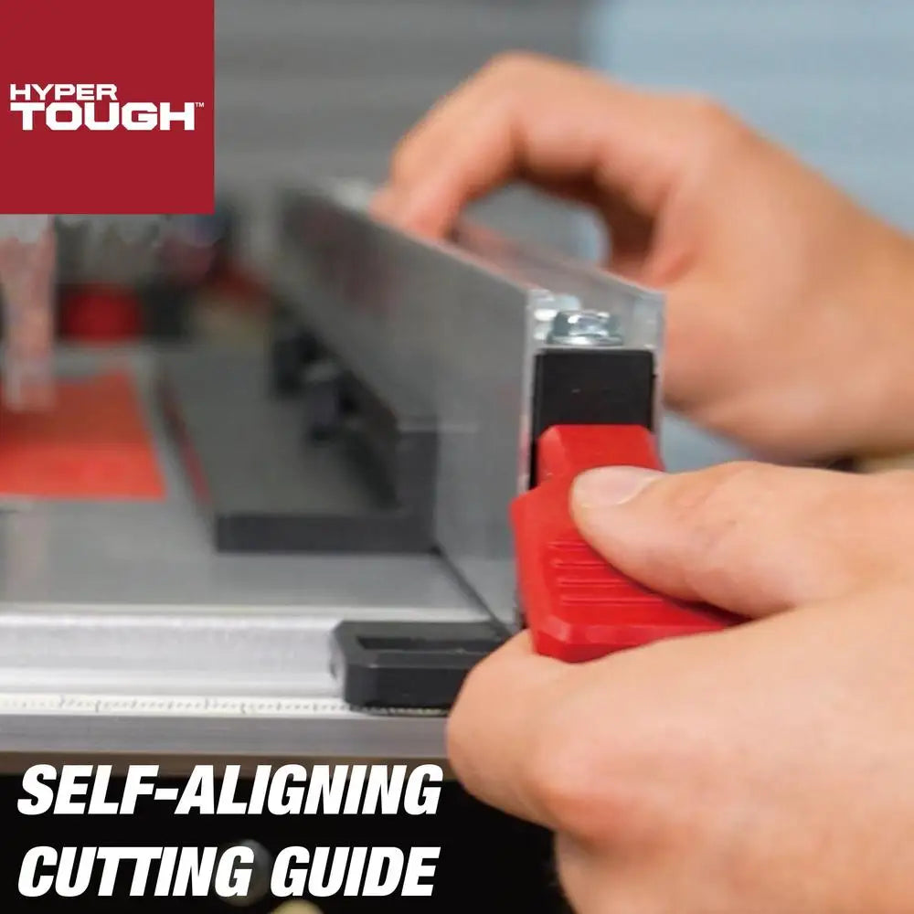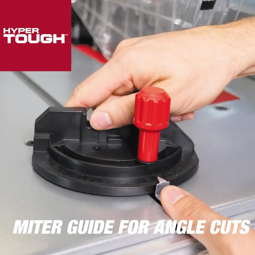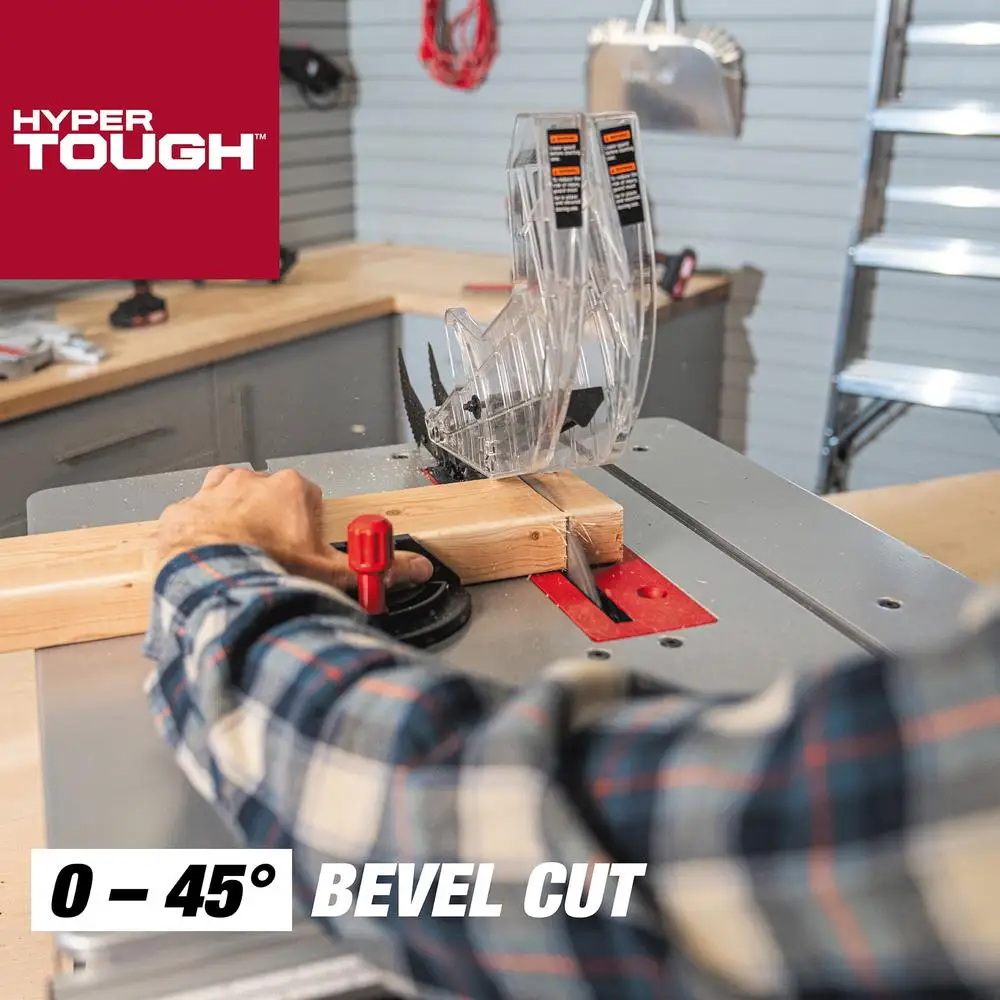 Powered by a 15Amp motor, the Hyper Tough Table Saw can generate up to 4800 RPM for powerful cutting and the 10 in.  table provides portable support for ripping operations, which is lightweight and easy to use.  With its 0-45 degree bevel capacity, the quick release lever allows for cuts between two positive stops at 0 and 45 degrees.  tooth blade, an aluminum rip fence, a rip fence extension, a miter gauge, a push stick, two blade wrenches and an operator's manual.