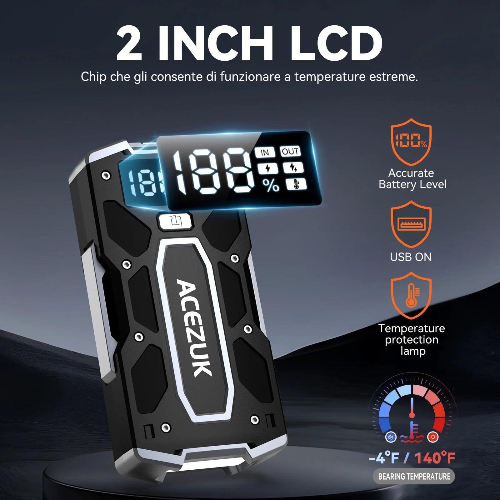 ACEZUK M02 car battery jump starter features a powerful maximum current of 4000A and is designed for most 12V cars for petrol engines up to 10.0L and diesel engines up to 8.0L. Suitable for cars, trucks, motorcycle, lawnmowers, vans, snowmobiles, etc.With this battery booster, you no longer worry about unexpected situations and you can start your vehicle in seconds.