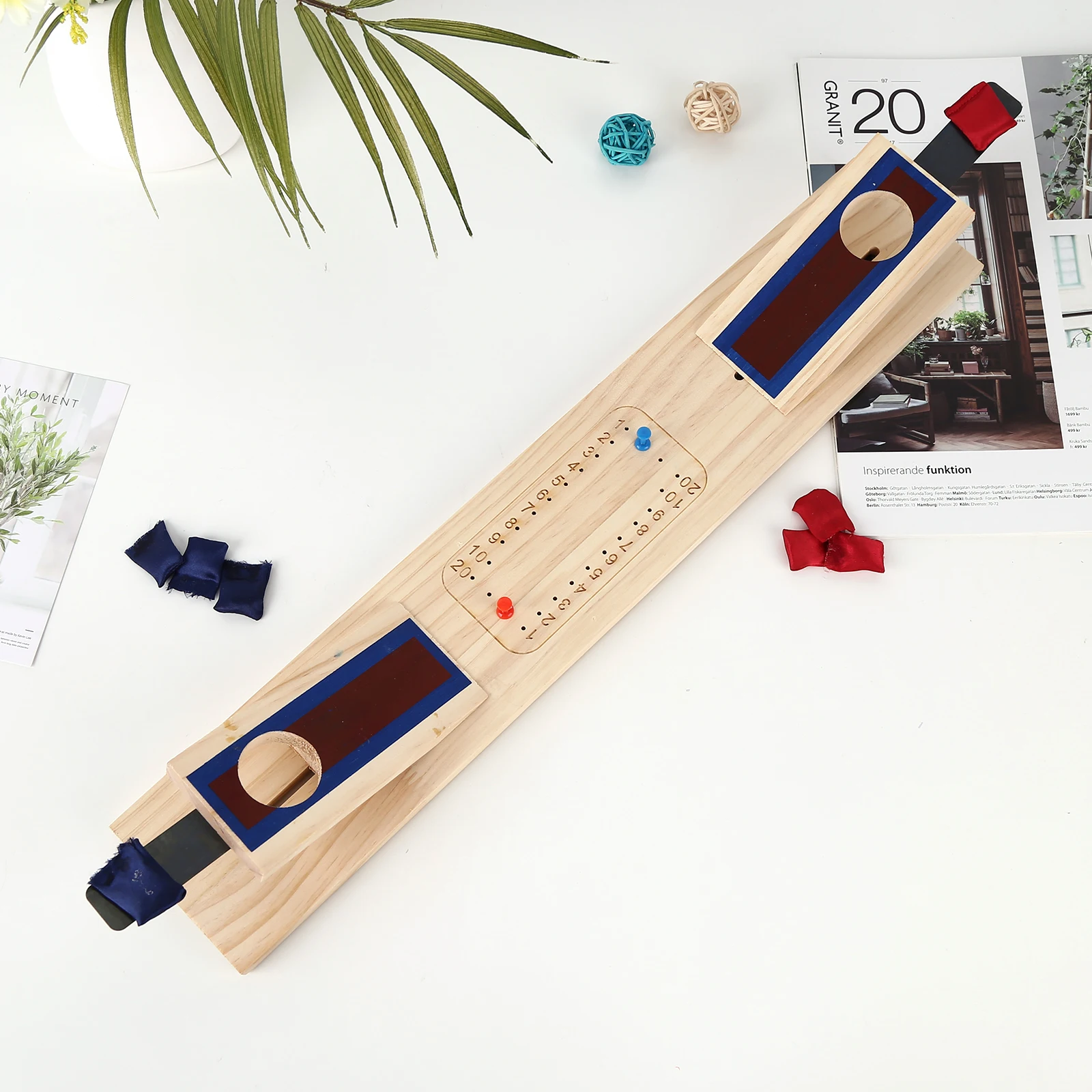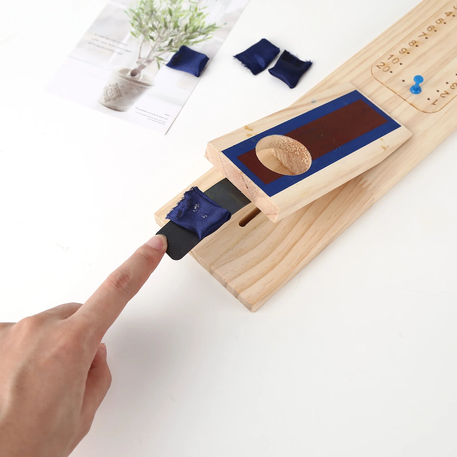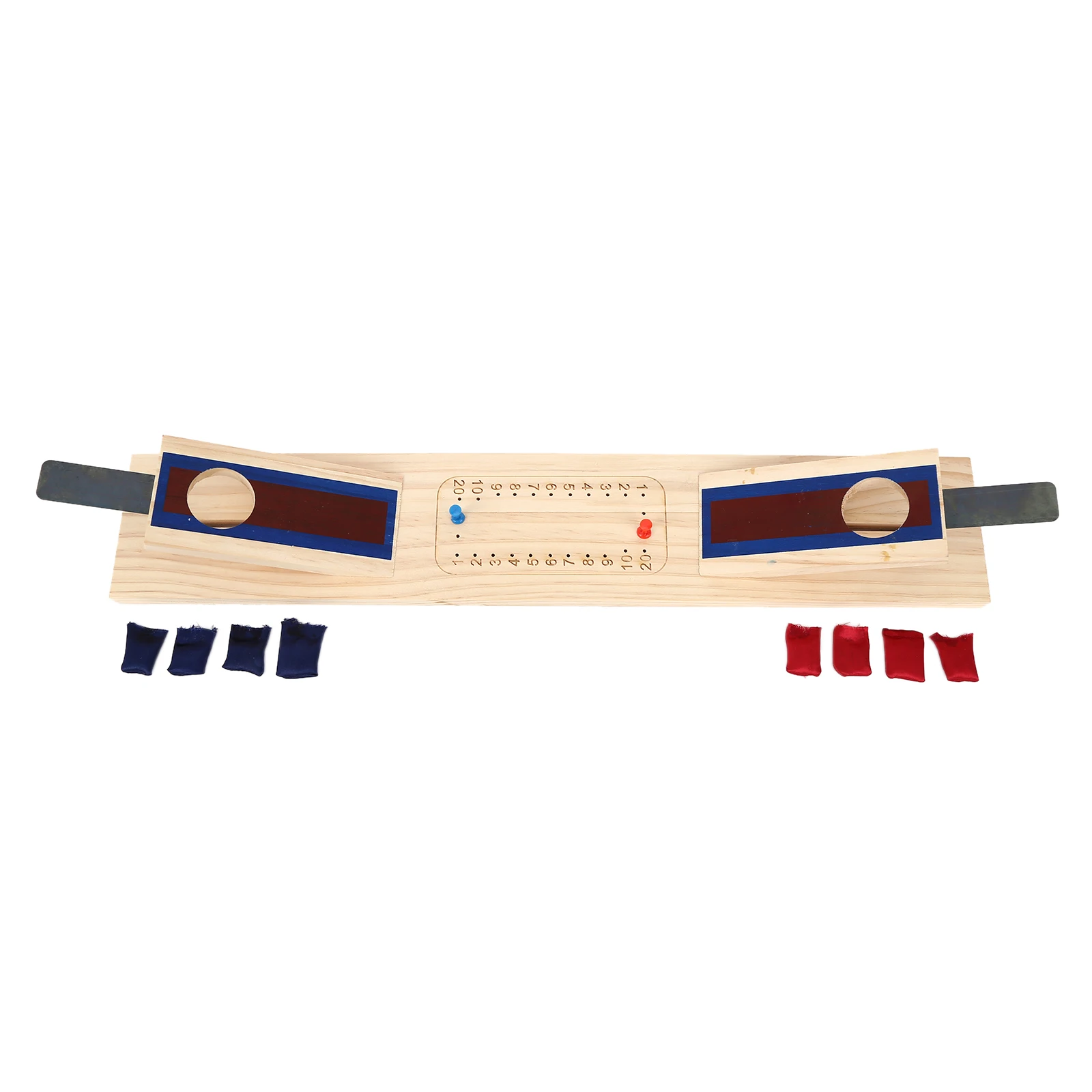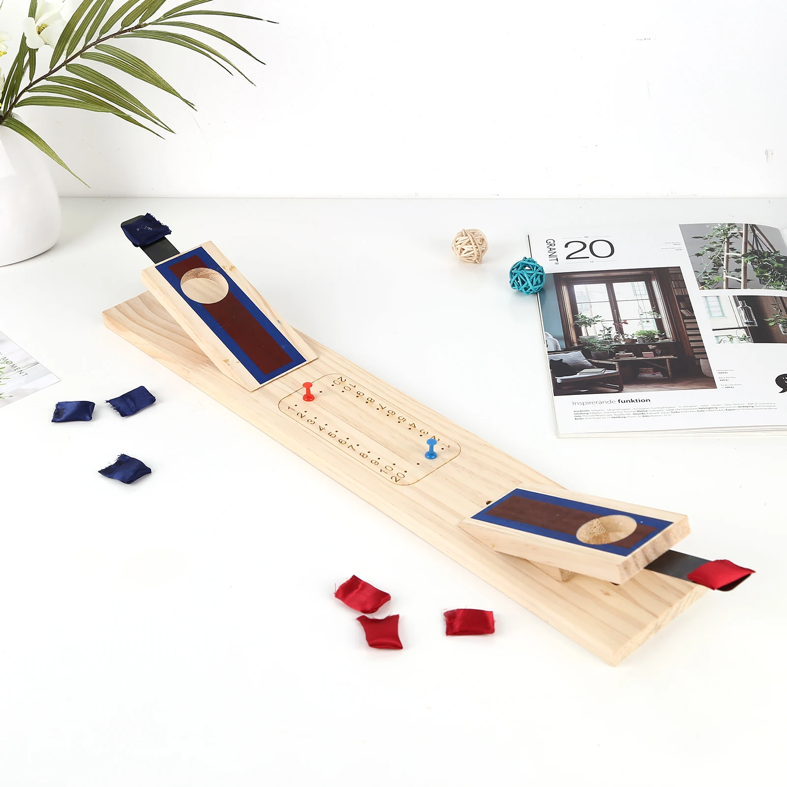 Classic Cornhole Set, Mini Portable Corn Hole Boards and 8 Bean Bags, Tabletop Toss Game for Outdoor Indoor Kids Adults Family Fun  Feature: Miniature design - The size is just right, and it can be played on the desktop or any place with small space but strong entertainment. The suit can be easily put into a backpack or handbag to join a party with friends. Sturdy material - The single contained board is made of strong MDF wood. This makes it enough to cope with daily competitions and travel. It also has an interesting football field design, which is sure to attract any sports fan. Fun for everyone - This mini bean bag set is a great way to introduce corn introduce games to children and adults. It teaches children the basic math and critical thinking for playing, keeping score, and developing motor skills. Easy to play - Big hole game includes 8 sandbags: 4 red and 4 blue. This makes it easy to play friendly matches and track scores and take turns. Bright colors are definitely suitable for any game room. Can play indoors. Your goal is to eject a small sandbag from the plastic fins into the opponent's hole. The shot that goes straight into the hole is worth three points, and the bean bag on the playing field is worth one point. When you (or your team) reach 21 points, the victory belongs to you. The solid wood board (with felt feet) has an integrated scorer and adjustable targets, so you can modify the difficulty level of the game according to your skills. Ideal for raining with friends or participating in epic championship-style events. Specification: Material: MDF wood and cloth Circuit board size: 50*9*3cm Includes 8 bean bags: 4 red and 4 blue. Note: Due to the different monitor and light effect, the actual color of the item might be slightly different from the color showed on the pictures. Thank you! Please allow 1-2cm measuring deviation due to manual measurement.