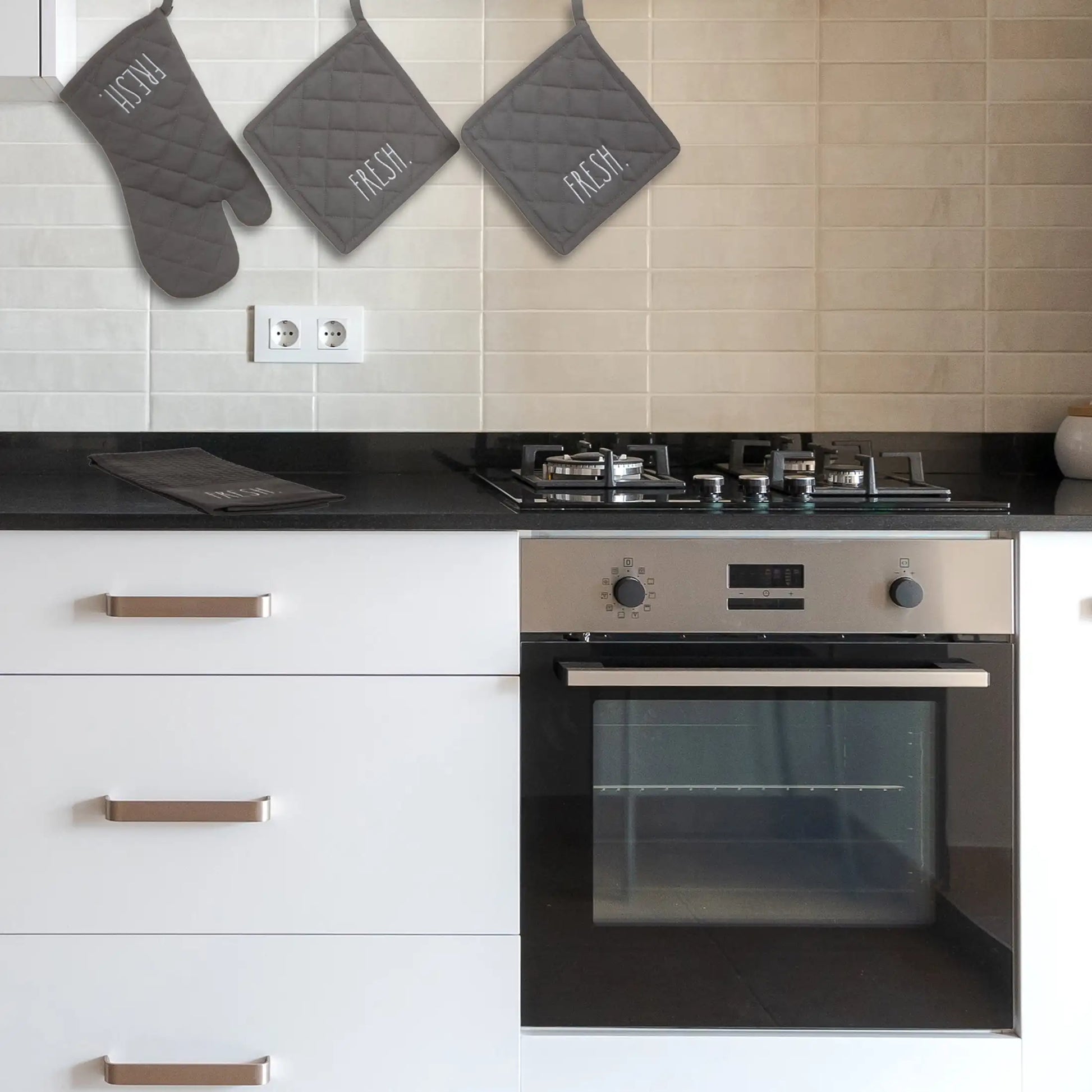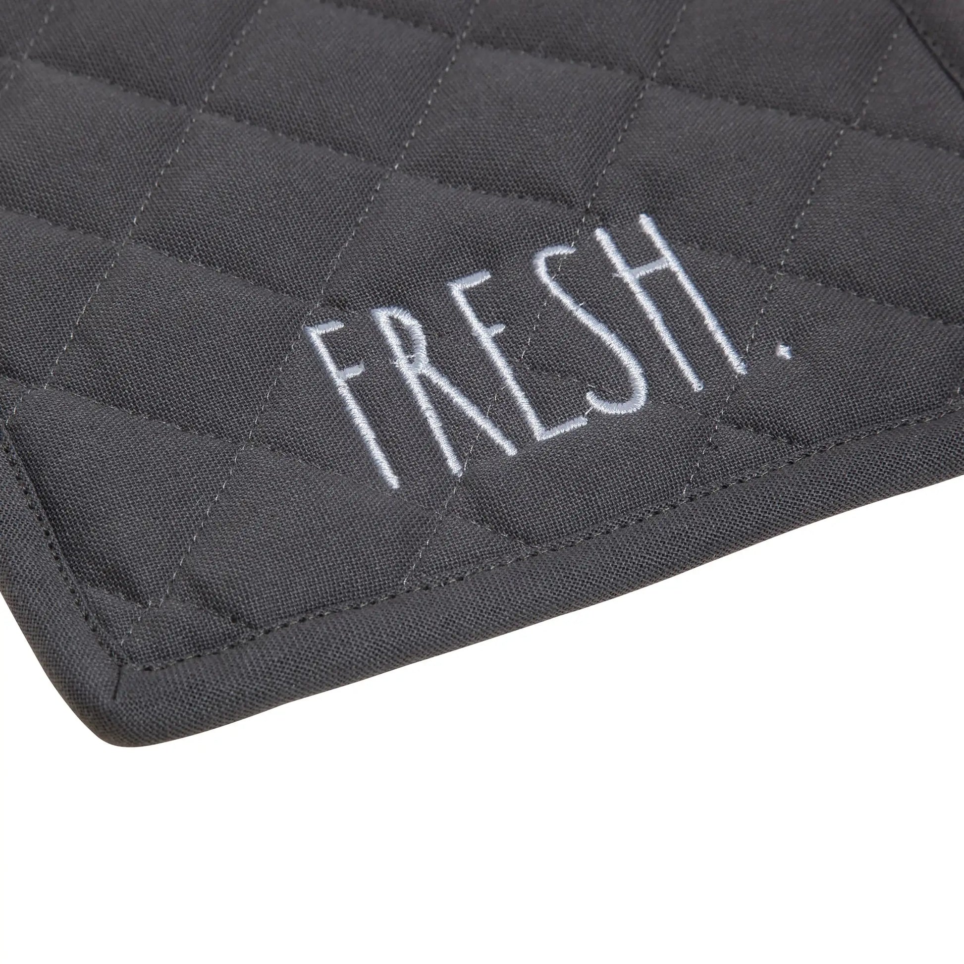 Crafted from 100% cotton, this set is not only durable but also machine washable for easy care. The gray base adorned with chic white "FRESH" embroidery adds a touch of elegance, making it a stylish decor piece for your kitchen.