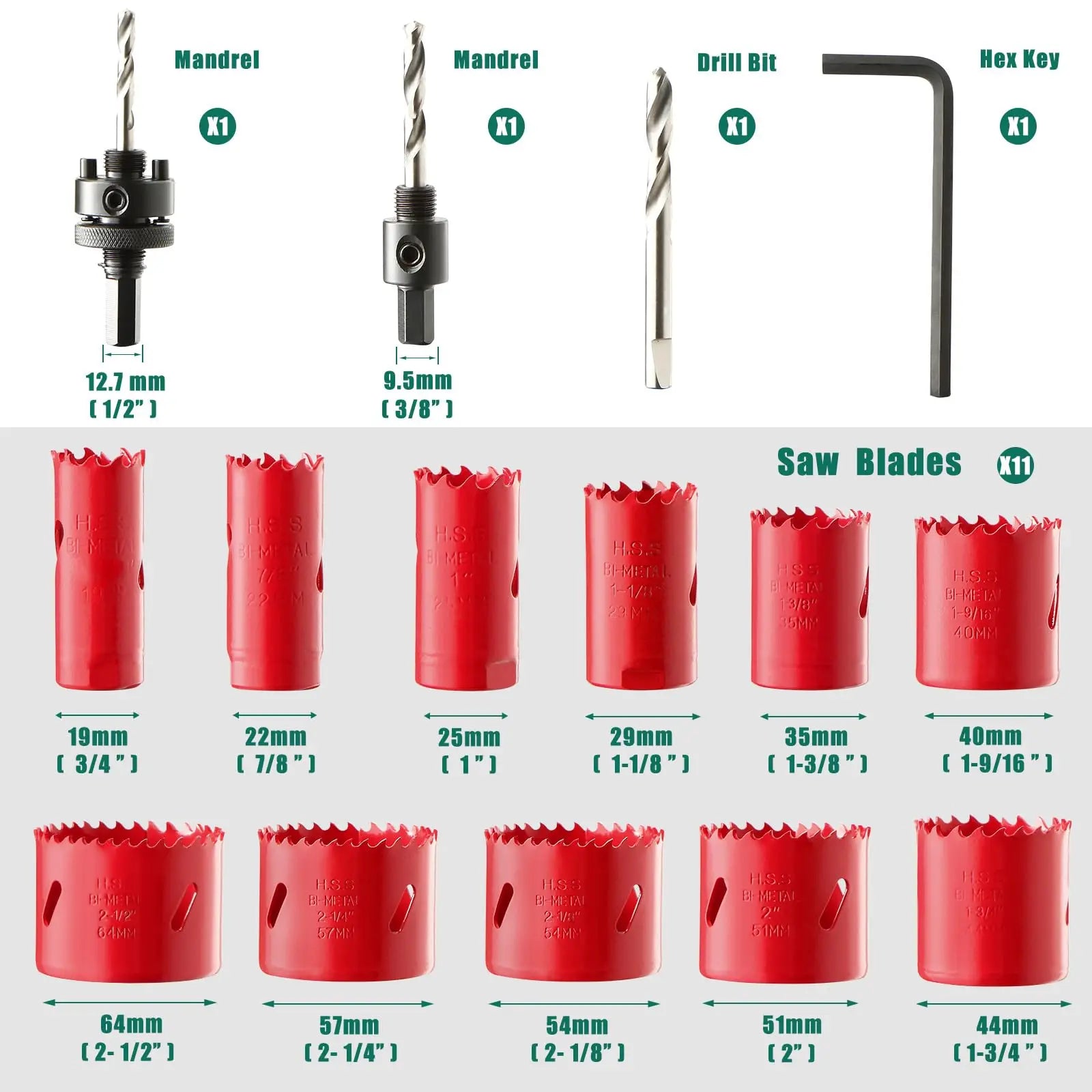🌟【11 HOLE SAWS AND 6 ACCESSORIES】 Including 11pcs size saw blades: 19mm(3/4"), 22mm(7/8"), 25mm(1"), 29mm(1-1/8"), 35mm(1-3/8"), 40mm(1-9/16"), 44mm(1-1/4"), 51mm(2"), 54mm(2-1/8"), 57mm(2-1/4"), 64mm(2-1/2"), max cutting depth of 40mm, 2pcs mandrels, 3pcs drill bits for easy replacement, 1pc hex key.