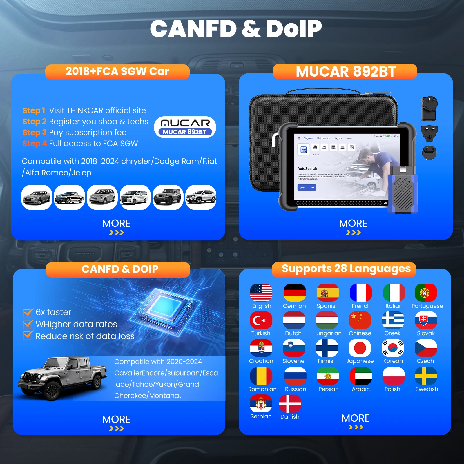MUCAR 892BT Scanner support CANFD Protocol, for GM (2019-);DOIP Protocol(Need to extra purchase Adapter), for BMW (F&G chassis), Volvo (2018-), Land Rover&Jaguar (2017-);Autoauth for FCA SGW, supports Chrysler, Jeep, Dodge, Fiat etc. 2017 and later;Guided Function for Volkswagen/Audi/Skoda/Seat, provides step-by-step repair guidance for you, prevent car fault setting caused by wrong operation.