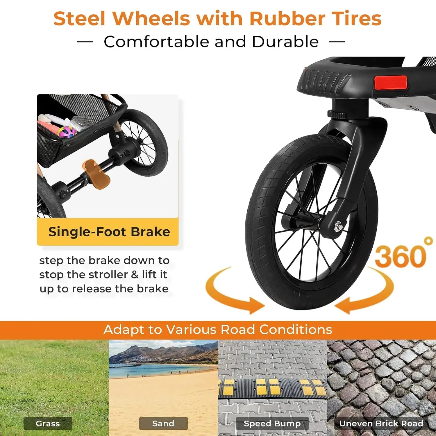 - 【Rubber Wheels】 3 heavy-duty rubber tires reduce vibration and maximize stability, no bump, and add extra comfort for your pet. The front wheel can be rotated 360° to adapt to different terrains. so your pet will enjoy a comfortable ride on any terrain. With a rear brake system to keep the dog and cat in place. It's perfect for injured, scared, puppy, or senior dogs