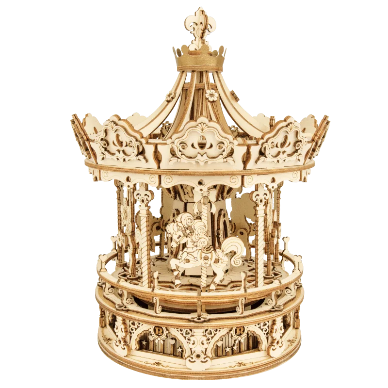 2. Log-Colored Appearance and Pure Machinery: The log-colored carousel holds up childhood memories. The entire kit does not require glue or other tools in the assembly process, all assembly relies on the bite between the wood partsLaser-Cut Technology: Benefits from its original design with amazing detail, they will give you hours of wonderful DIY fun.