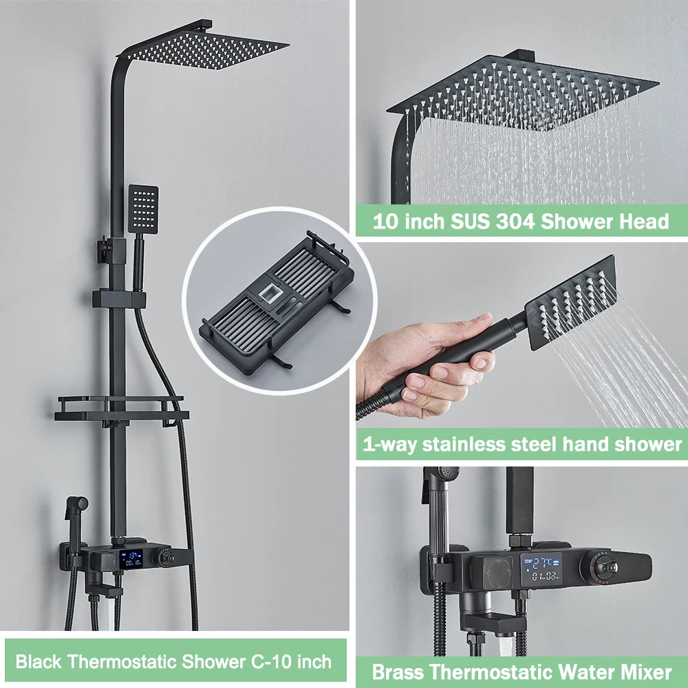 Rozin Black Thermostatic Shower Faucet Set with Digital Mixer Rainfall delivers spa-worthy comfort with precise temperature control, a generous 10-inch rainfall shower, and a modern black-brass finish that elevates any bathroom style.