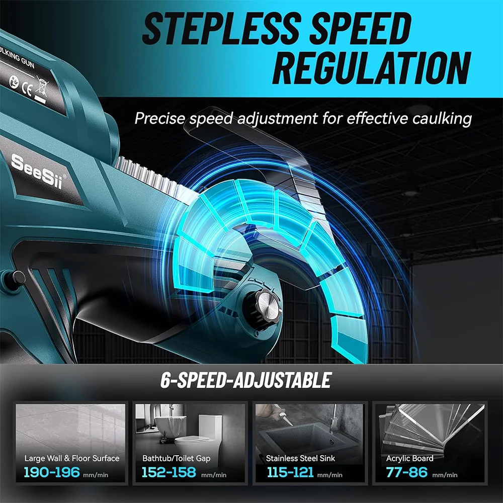 STEPLESS SPEED REGULATION & 6-SPEED-ADJUSTABLE: Six varying speeds allow you to control flow / move speed that Powerful enough to handle most adhesives and caulks.Precise adjustable forcing speed from 0 to 7.5mm/s.The slight movement of the speed switch button can make you feel the changing speed of the plunger rod move forward.Tips:Better to start with the lowest speed to test flow practice