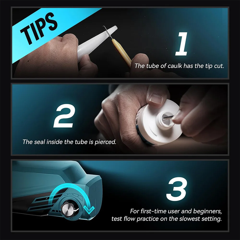 LED LIGHT & ACCESSORIES: The built in light is a nice feature when working is dark spaces like attics, crawl spaces, garages or other.Bright enough to let you notice the caulk flow and seam.Tips:Better to start with the lowest speed to test flow practice.Kits includes - Electric caulking gun x 1, 2.0AH rechargeable Li-ion battery x 2, charger x 1,,User manual x 1