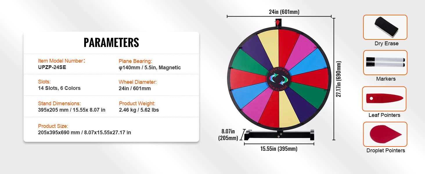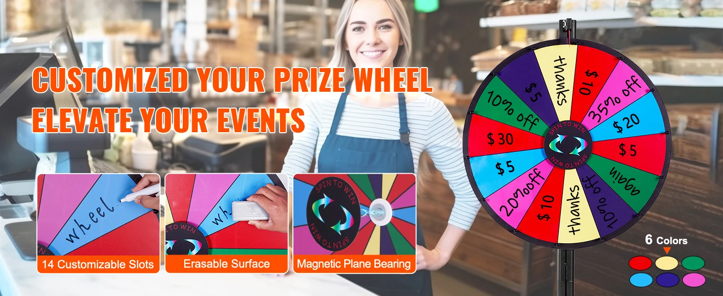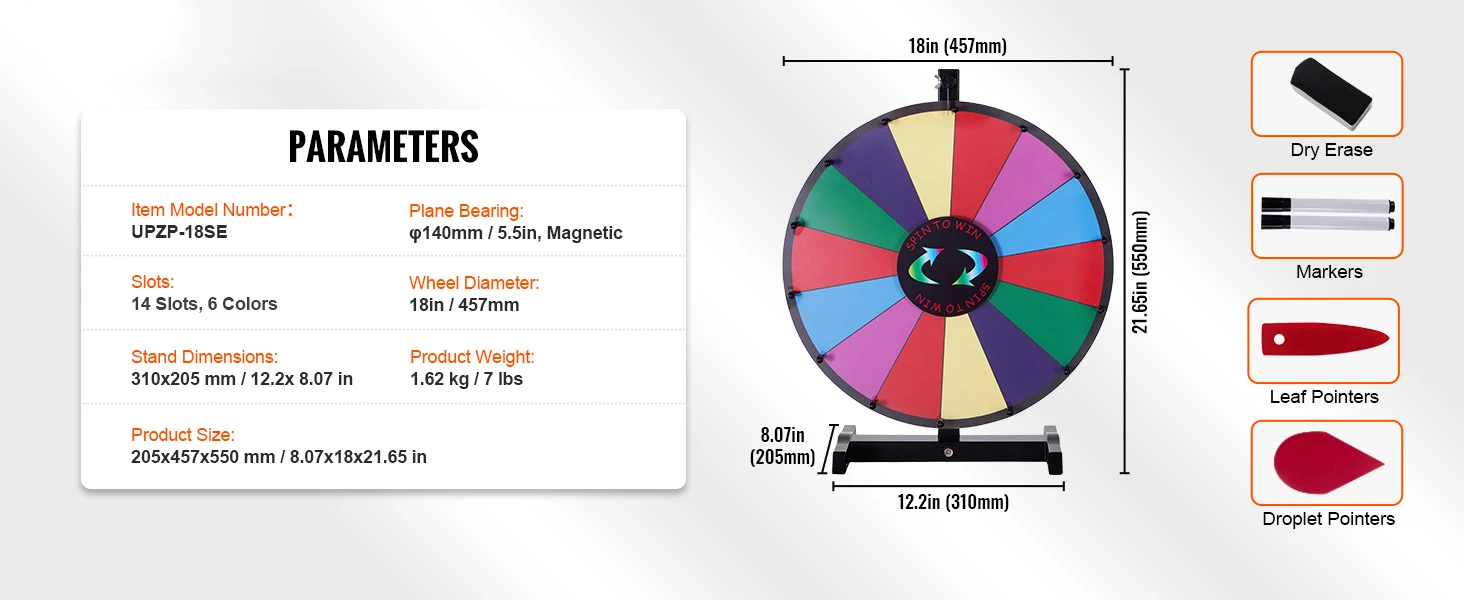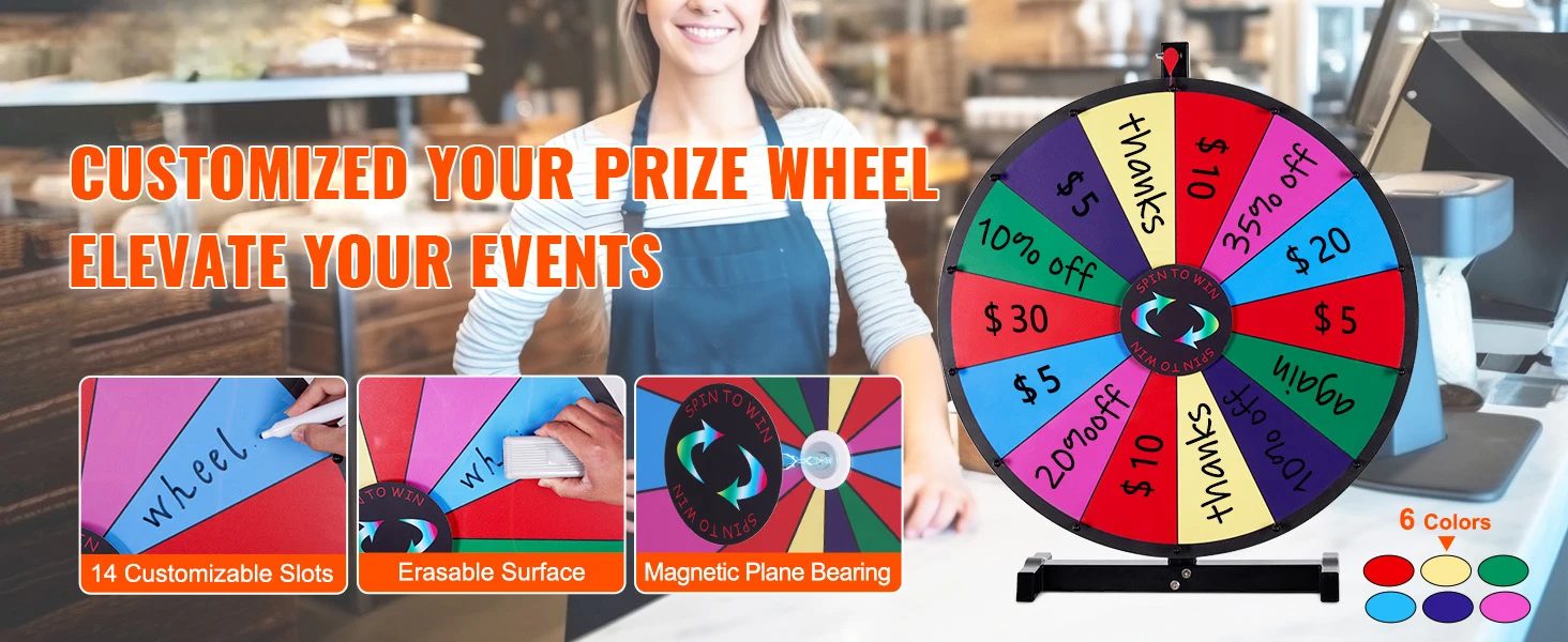 - Customizable & Editable: Our prize wheel features customizable slots, allowing you to create personalized games effortlessly. Stand out from the crowd with colorful slots and a smooth, rewritable writing board.
