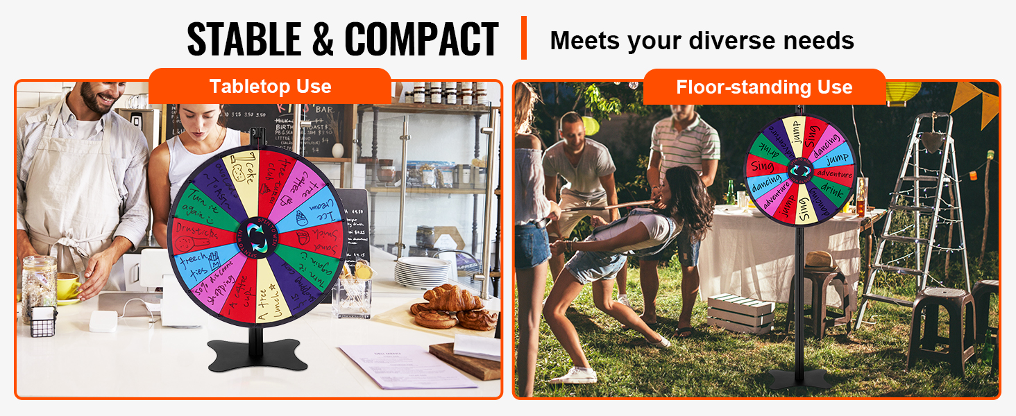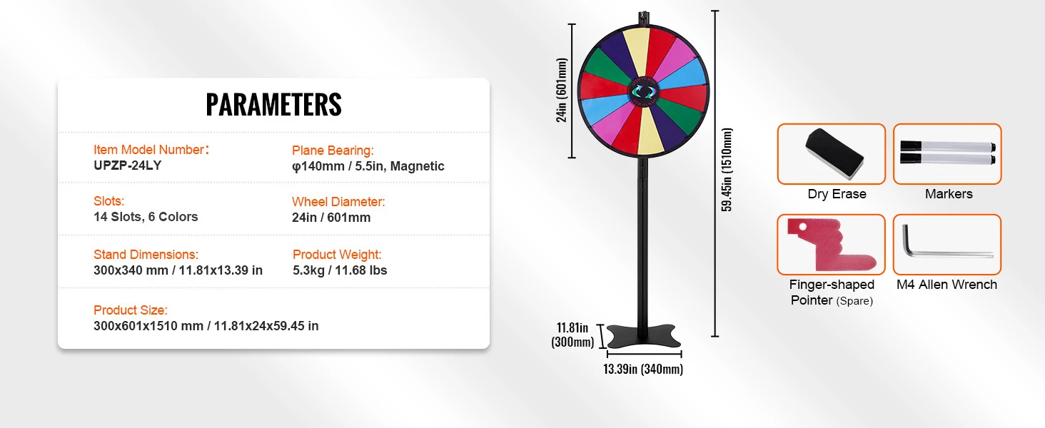 - Exciting Atmosphere: Want to liven up your event? Our spinning prize wheel comes with a clicking sound as it spins, adding tension and excitement to the game. Attract attention and create a buzz at your event!