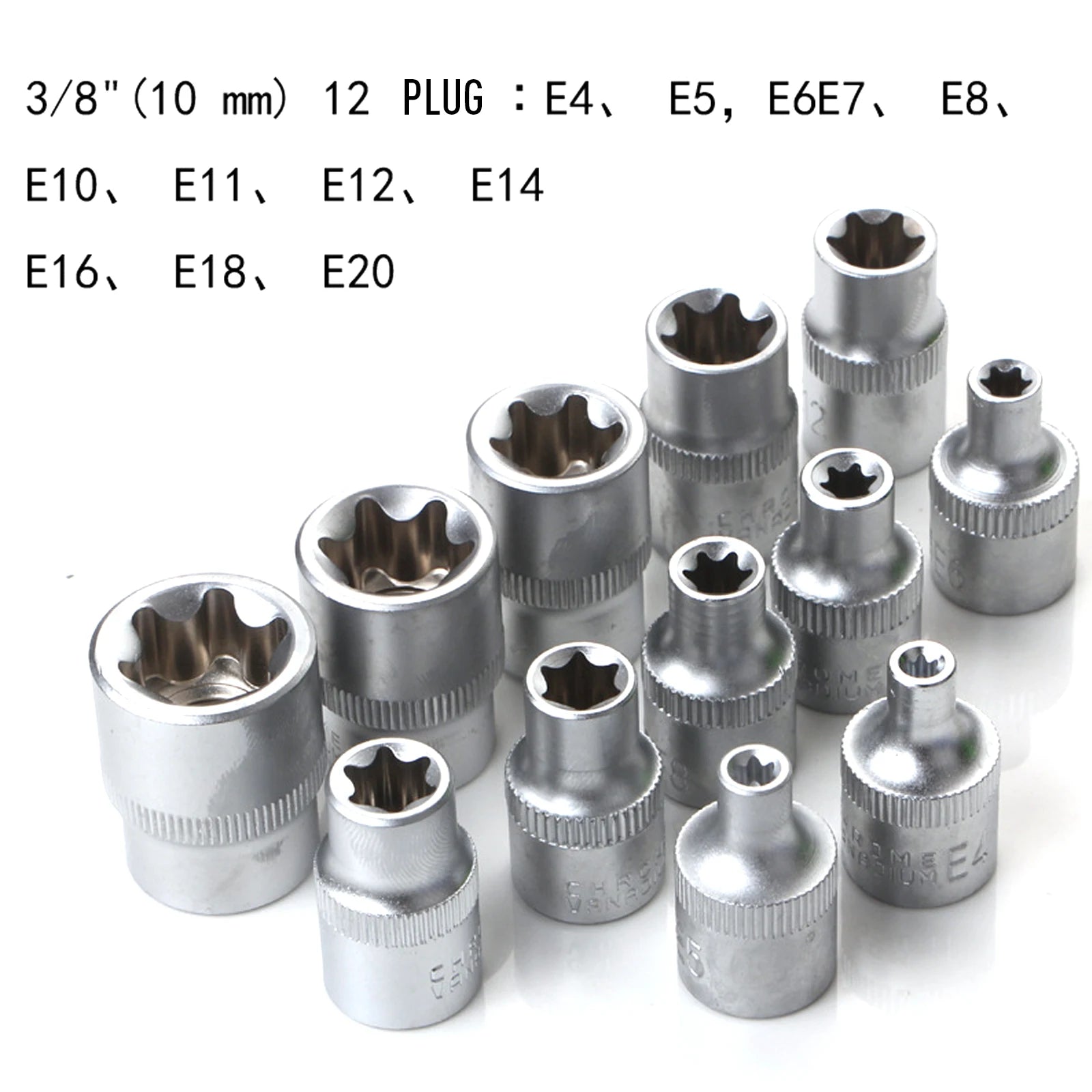 8Pcs 3/8'' Dr. E Sockets: E8,10,11,12,14,16,18,20
