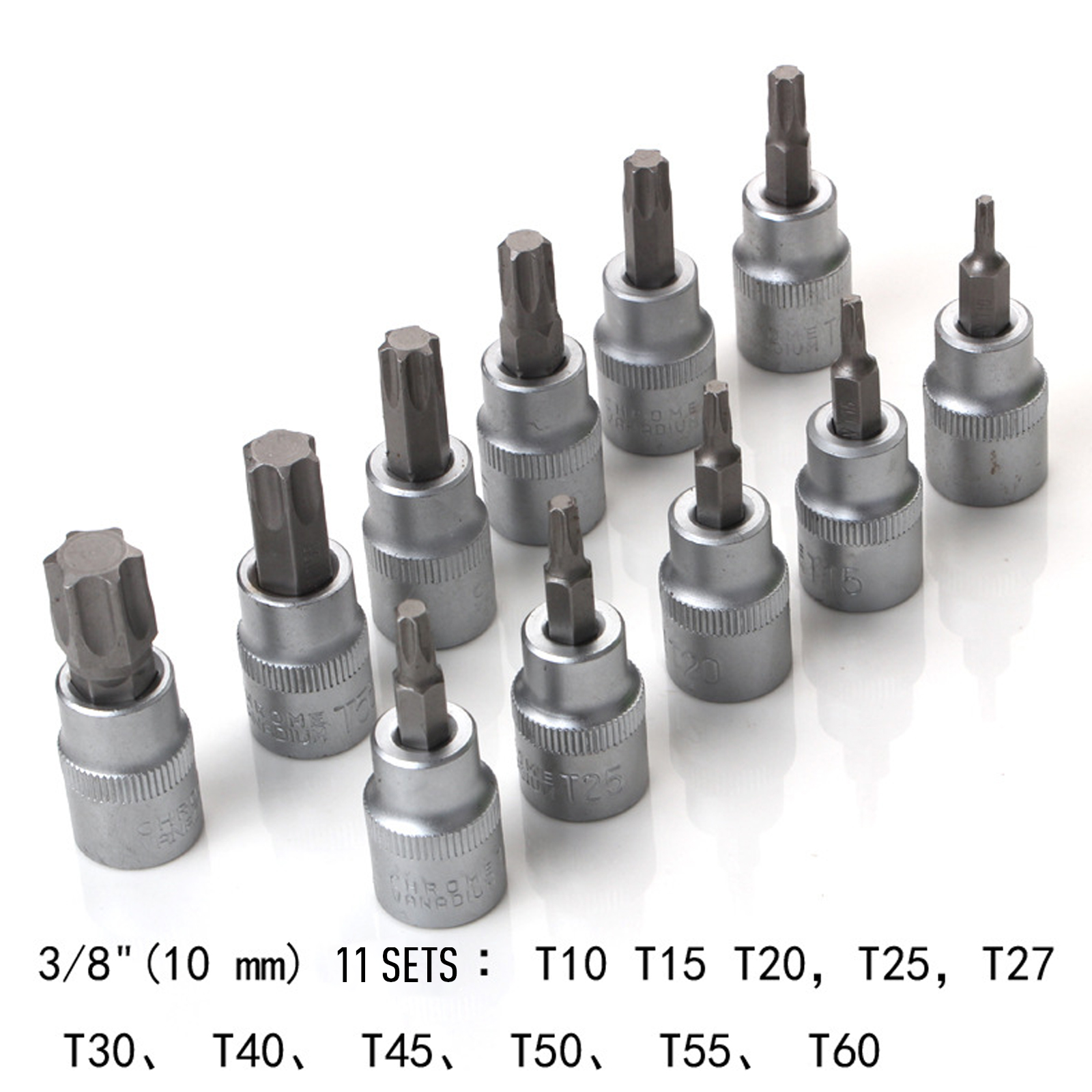 11Pcs 3/8'' Dr. Bit Socket: T10,15,20,25,27,30,40,45,50,55,60