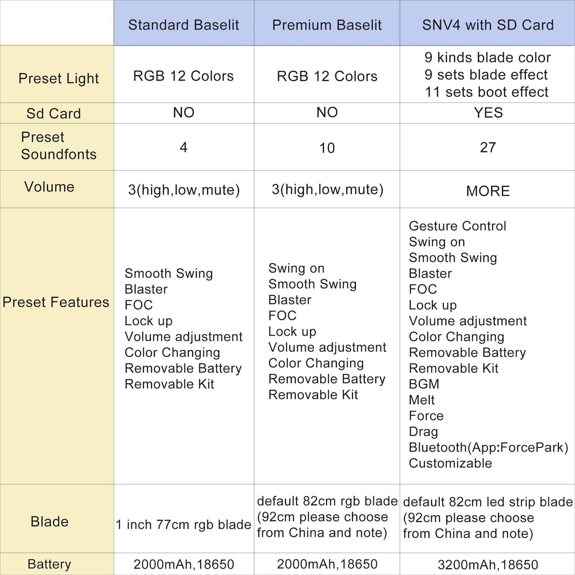 Premium Baselit means It is the rgb lightsaber with 10 soundfonts and 82cm blade)