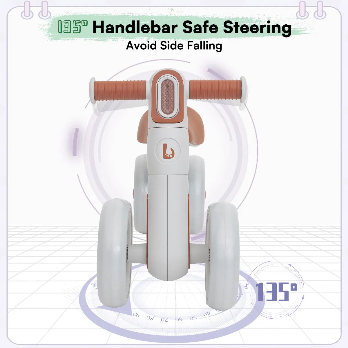 Safety Assurance: Featuring no pedals and fully widened enclosed wheels prevent baby's feet from getting caught. 135°steering limit can prevent tipping, and kids' bike front wheels with gravity steering design add safety. Clear PC material at the center of the infant and toddler balance bike wheels make a captivating sci-fi touch.