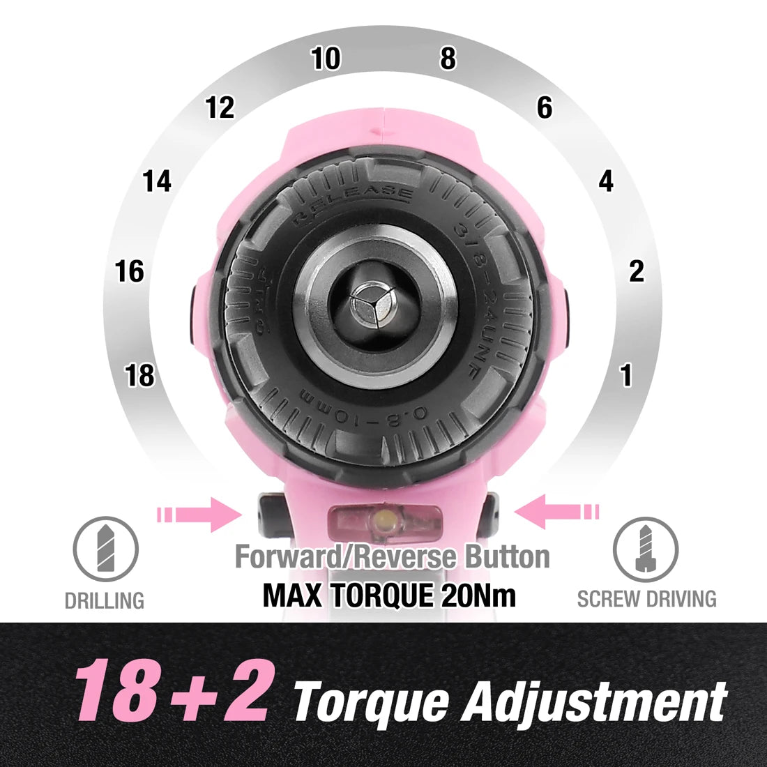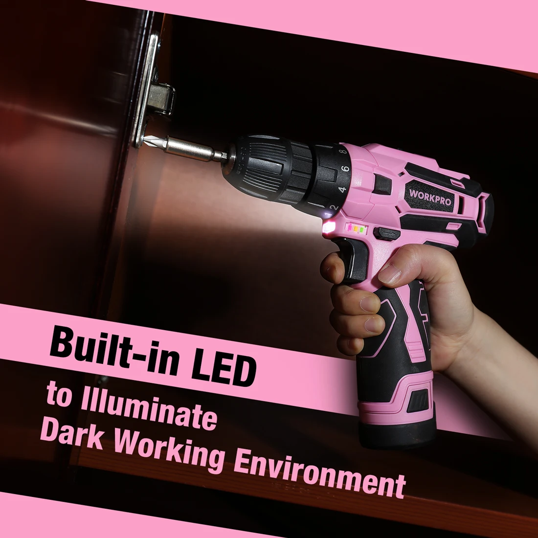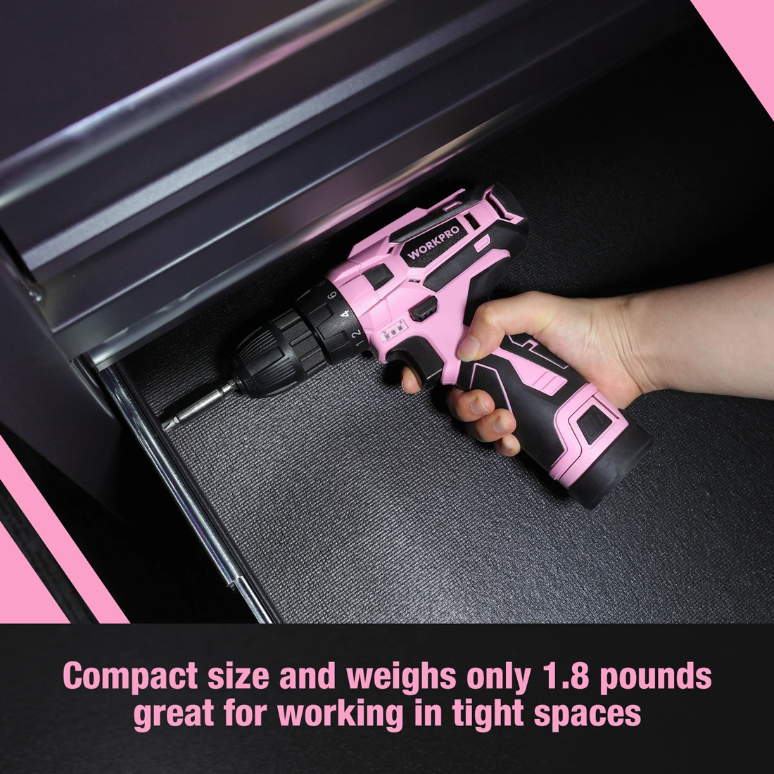 WORKPRO Pink Cordless Drill Driver Set, 12V Electric Screwdriver Driver Tool Kit, 3/8" Keyless Chuck